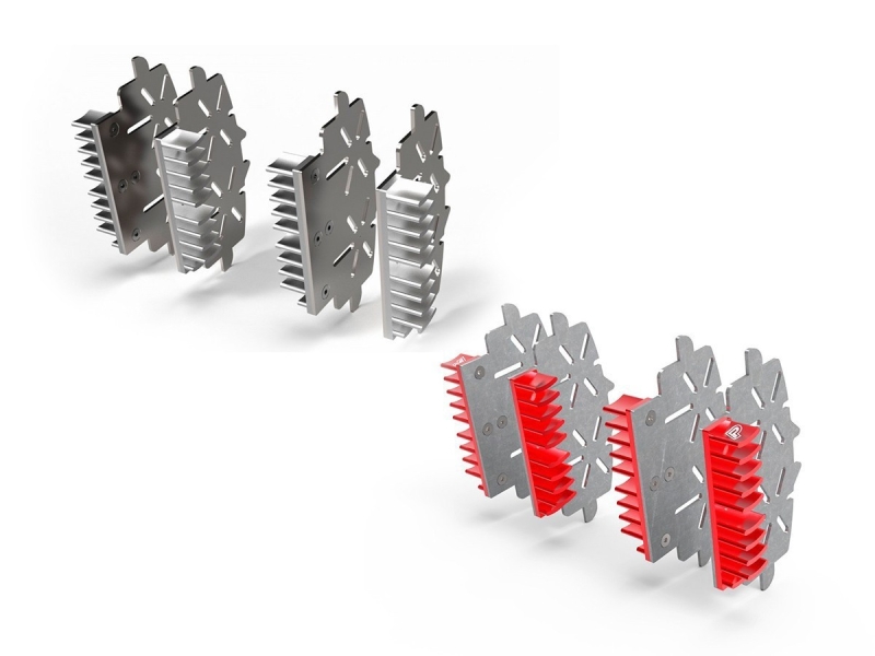 Die innovativen Bremsplattenkühler reduzieren die Temperatur der Bremsbeläge um bis zu 20 Grad und sorgen so für eine spürbare Verbesserung der Bremsleistung. Sie erhöhen die Stabilität beim Anbremsen und verlängern gleichzeitig die Lebensdauer der Bremsbeläge. Der Hauptkörper besteht aus speziellem thermischem Stahl mit hoher Wärmeleitfähigkeit, ergänzt durch einen aus Aluminium gefertigten Kühlkörper zur effektiven Wärmeableitung. Die Montage erfolgt einfach durch Einsetzen der Kühlerplatten hinter die Bremsbeläge, im Lieferumfang sind vier Platten enthalten und damit passend für zwei Bremssättel bzw. ein komplettes Vorderrad.