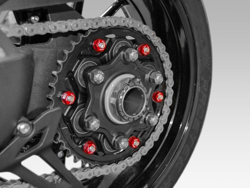 Optional kann auch ein Set Flanschmuttern in verschiedenen Farben dazu bestellt werden. Das Mutternset für den Kettenradflansch ersetzt die originalen Muttern 1:1 und die Muttern werden entsprechend mit dem selben Drehmoment angezogen.