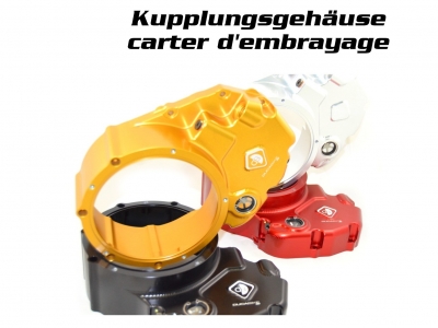 Verschiedene Farbkombinationen verfügbar. Zusätzlich können noch die Druckplatte und Federplatte mitbestellt werden, welche dank dem offenen Kupplungsdeckel nun ebenfalls sichtbar sind und somit das Gesamtbild des Motorrades vereinheitlichen.