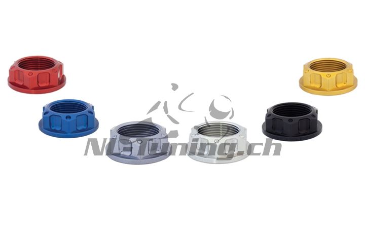 Sehr hochwertige Duraluminium Muttern (7075T6). Durch die Bearbeitung an CNC-gesteuerten Maschinen ist ein attraktives Design und ein raffinierter Look realisierbar. Die 6 Ausbuchtungen und die 6 frontalen Bohrungen reduzieren Gewicht, ohne dass die Stabilität darunter leidet. Das Anzugsmoment bleibt unverändert. Die Montage erfolgt mit einem handelsüblichem Ringschlüssel. Es stehen 6 verschiedene eloxierte Farbtöne zur Auswahl.