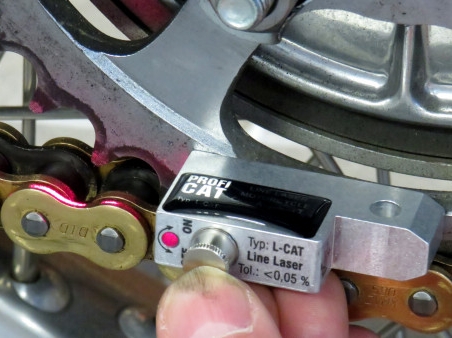 Der Kettenlaser wird auf den Kranz gehalten und der Laser zeigt an der Kette an, ob das Rad gerade verbaut ist oder nicht.