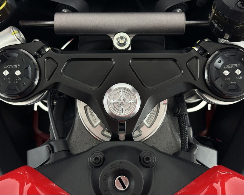 Die Motocorse Lenkkopf-Mutter ist eine hochwertige, CNC-gefräste Nachrüstlösung aus Aluminium. Sie ersetzt die serienmäßige Mutter und ist ohne weitere Modifikationen montagebereit. Dank der stabilen Konstruktion sorgt sie für eine sichere Verbindung zwischen Gabel und Rahmen.