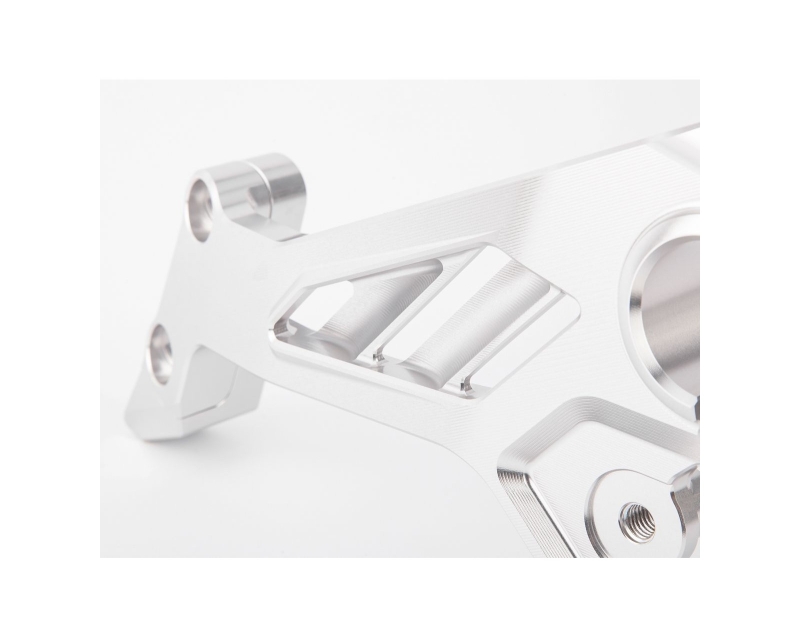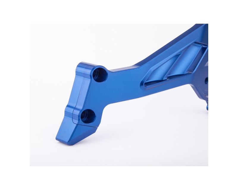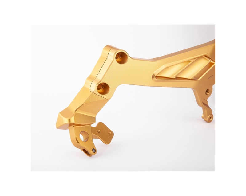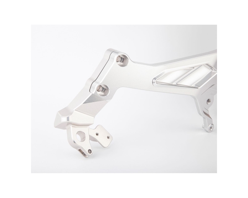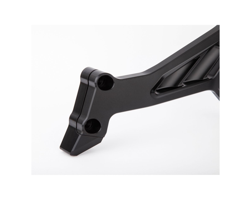 Das Set ersetzt die serienmäßigen seitlichen Rahmenplatten durch vier CNC-gefräste Aluminium Platten 1:1. Die originalen Fussrasten können ohne weiteres wieder montiert werden. Die linke Seite besteht aus zwei Teilen eine obere Platte für die Fußrastenhalterung und eine untere, mit der Halterung für den Seitenständer.