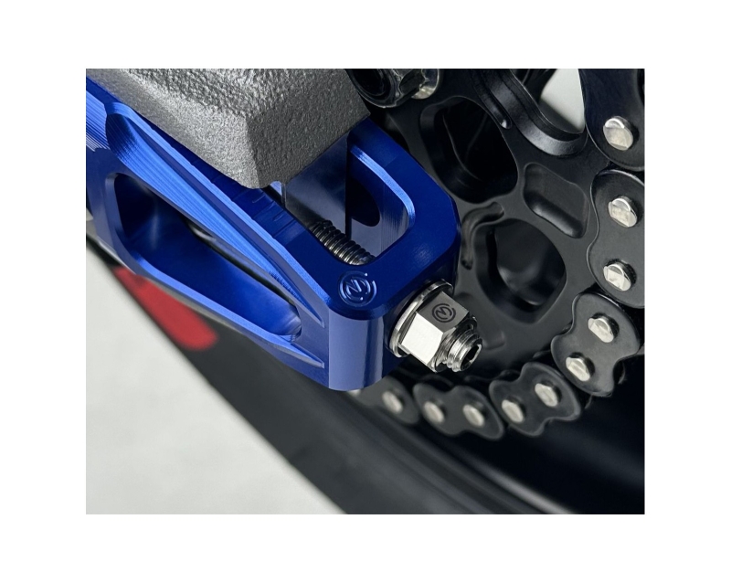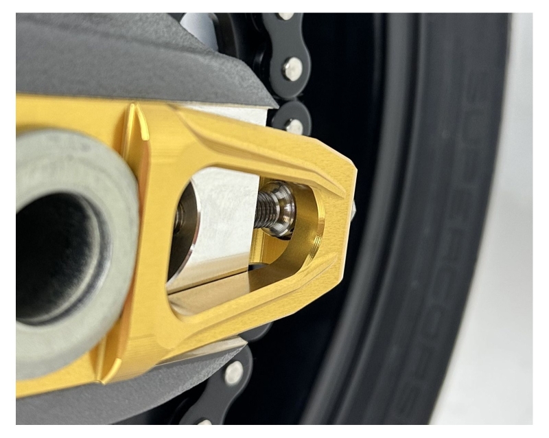 Im Set sind zwei Titanschrauben zur Einstellung der Kettenspanner sowie dazu passende selbstsichernde Muttern dabei. Gefertigt aus Titan, bieten die Bauteile eine hohe Stabilität bei gleichzeitig deutlich reduziertem Gewicht (über 35 % Gewichtsersparnis im Vergleich zu Standardteilen). Das Kit ist direkt mit den originalen Halterungen kompatibel und ersetzt die OEM‑Teile ohne Modifikationen.