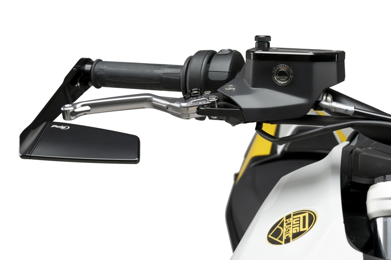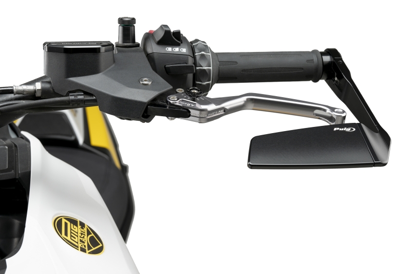 Ein innovativer Lenkerendenspiegel mit Doppelfunktion: nutzbar als Rückspiegel und Handschutz. Der klappbare Spiegel verwandelt sich bei Bedarf in einen aerodynamischen Spoiler.