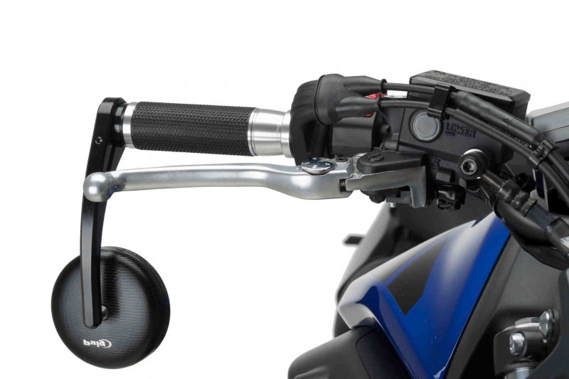 Der Lenkerendspiegel kommt falls nötig direkt mit den passenden Adaptern für die Befestigung am Lenkerend. Der Spiegel ist auch für die neusten Bikes zugelassen und hat 94mm Durchmesser der Spiegelfläche und eine E-Nummer. Dank einem 135mm langen Arm kommt der Spiegel auch nicht in den Weg bei der Betätigung des Gasgriffes. Der Spiegel ist aus hochwertigem Aluminium gefertigt.