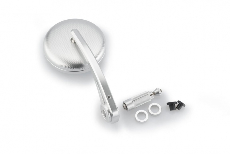 Der Lenkerendspiegel kommt falls nötig direkt mit den passenden Adaptern für die Befestigung am Lenkerend. Der Spiegel ist auch für die neusten Bikes zugelassen und hat 94mm Durchmesser der Spiegelfläche und eine E-Nummer. Dank einem 135mm langen Arm kommt der Spiegel auch nicht in den Weg bei der Betätigung des Gasgriffes. Der Spiegel ist aus hochwertigem Aluminium gefertigt.
