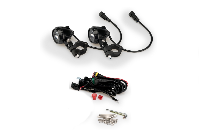 - Das Set beinhaltet zwei Scheinwerfer inklusive Befestigungen, einen wasserdichten Schalter (für die Bedienung am Lenker) sowie einem Kabelstrang mit Sicherung für den direkten Anschluss an die Batterie